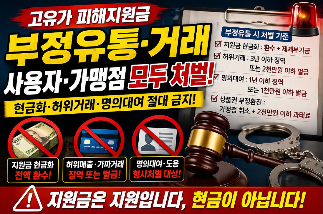 “지원금은 반드시 소비 진작이라는 목적을 위해 사용되어야 합니다. 이를 현금화하거나 편법 거래할 경우 단순 위반이 아닌 형사처벌 대상이 됩니다.”