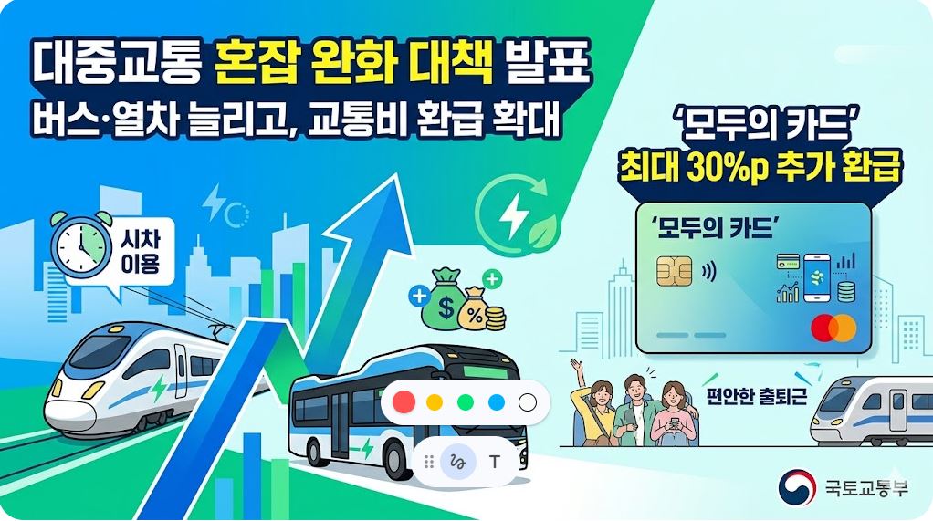 가장 피부에 와닿는 정책은 단연 교통비 환급입니다. 정부는 대중교통 수요를 분산하기 위해 '경제적 유인책'을 꺼내 들었습니다.