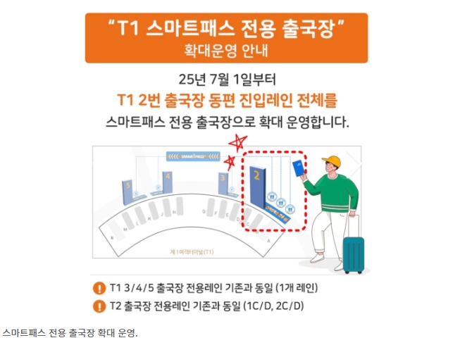 • 2025년 7월부터: T1의 2번 출국장은 스마트패스 전용으로 운영 중