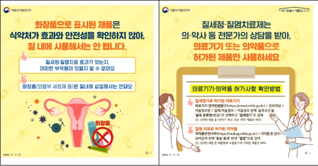 | 신준수 바이오생약국장: “질 내 세정·소독이나 질병 예방·치료가 필요하다면 반드시 전문가의 도움을 받아 검증된 의약품이나 의료기기를 사용해야 합니다. 의학적 효능·효과를 내세우는 화장품 광고는 일단 의심하고 현혹되지 않는 소비자들의 현명한 구매가 필요합니다.” |