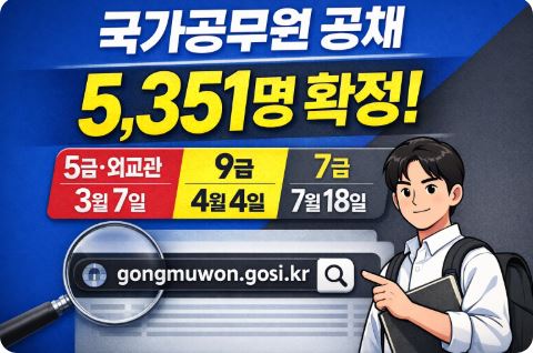 공무원 수험생이라면 가장 먼저 확인해야 할 정보는 선발인원·시험일정·접수 방식입니다. 인사혁신처는 2026년도 국가공무원 공개경쟁채용시험 등 계획을 관보 및 각종 매체를 통해 공식 공고하고, 올해 공채 선발인원을 총 5,351명으로 확정했습니다.
