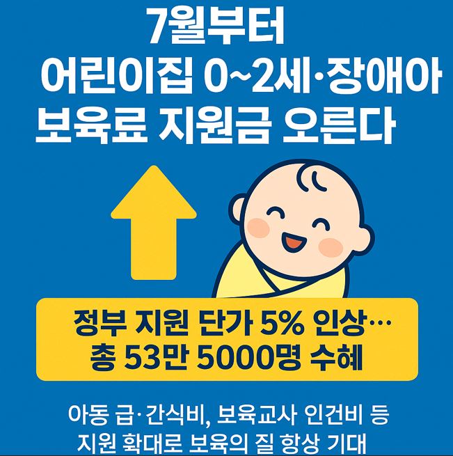 교육부는 2025년 7월부터 0~2세 영유아 및 장애아 보육료 지원 단가를 5% 인상한다고 밝혔습니다. 이번 조치는 제2회 추가경정예산안 통과를 기반으로 이뤄졌으며, 전국 약 53만 5천 명의 아동이 혜택을 받게 됩니다.